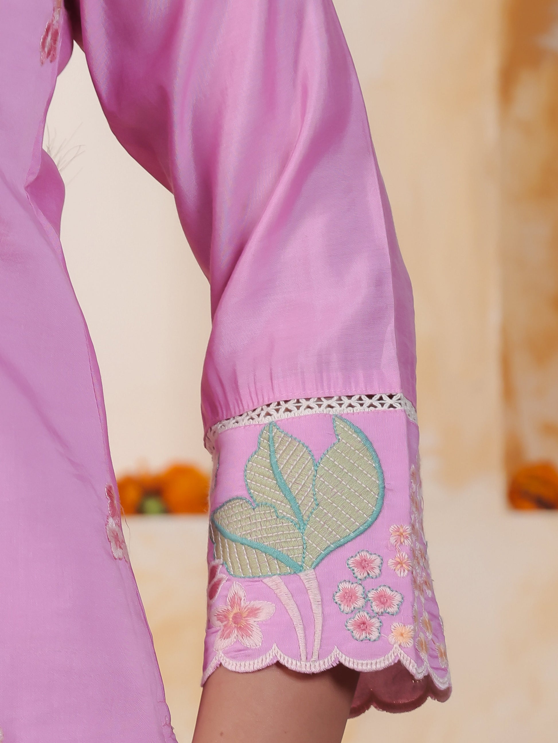 Thread Embroidery Baby Pink Roman silk Straight Kurta