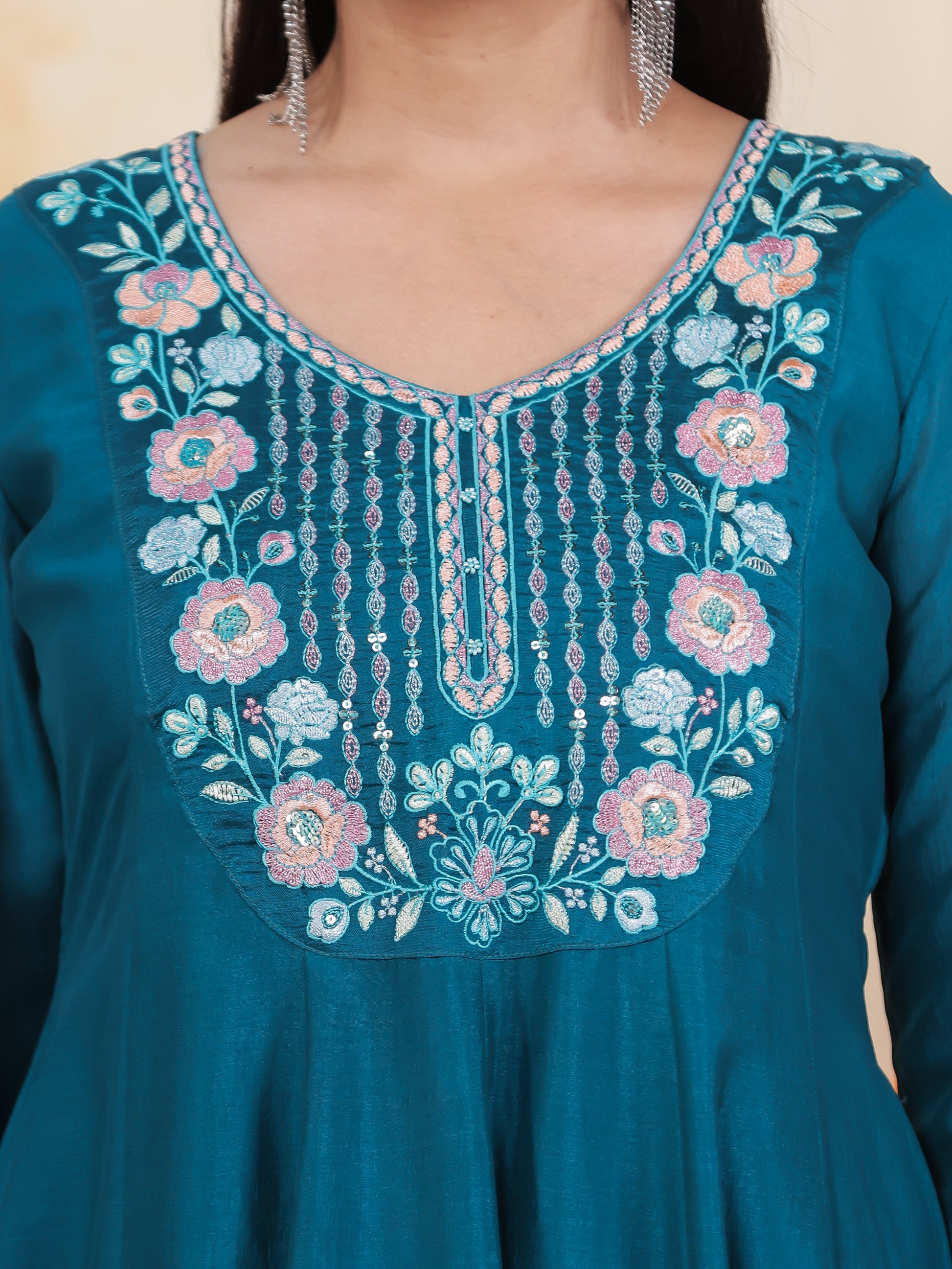 Embroidered Teal Roman silk Gathered Kurta