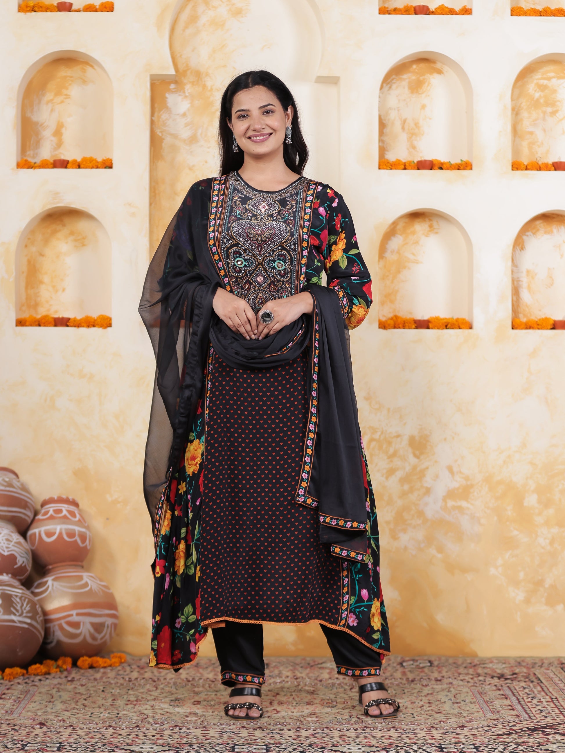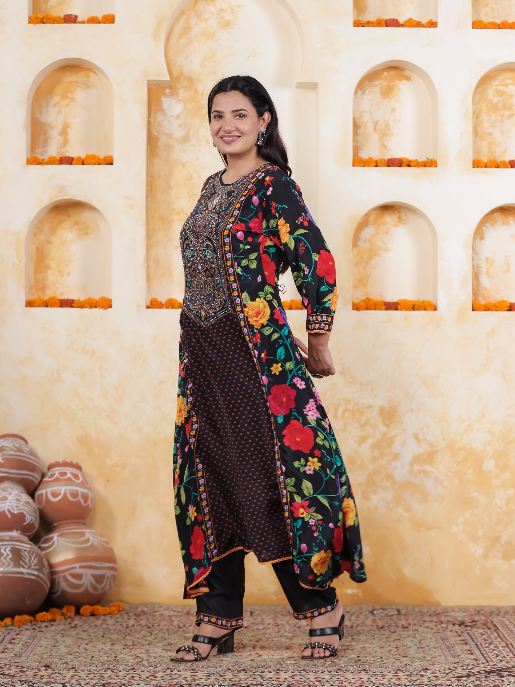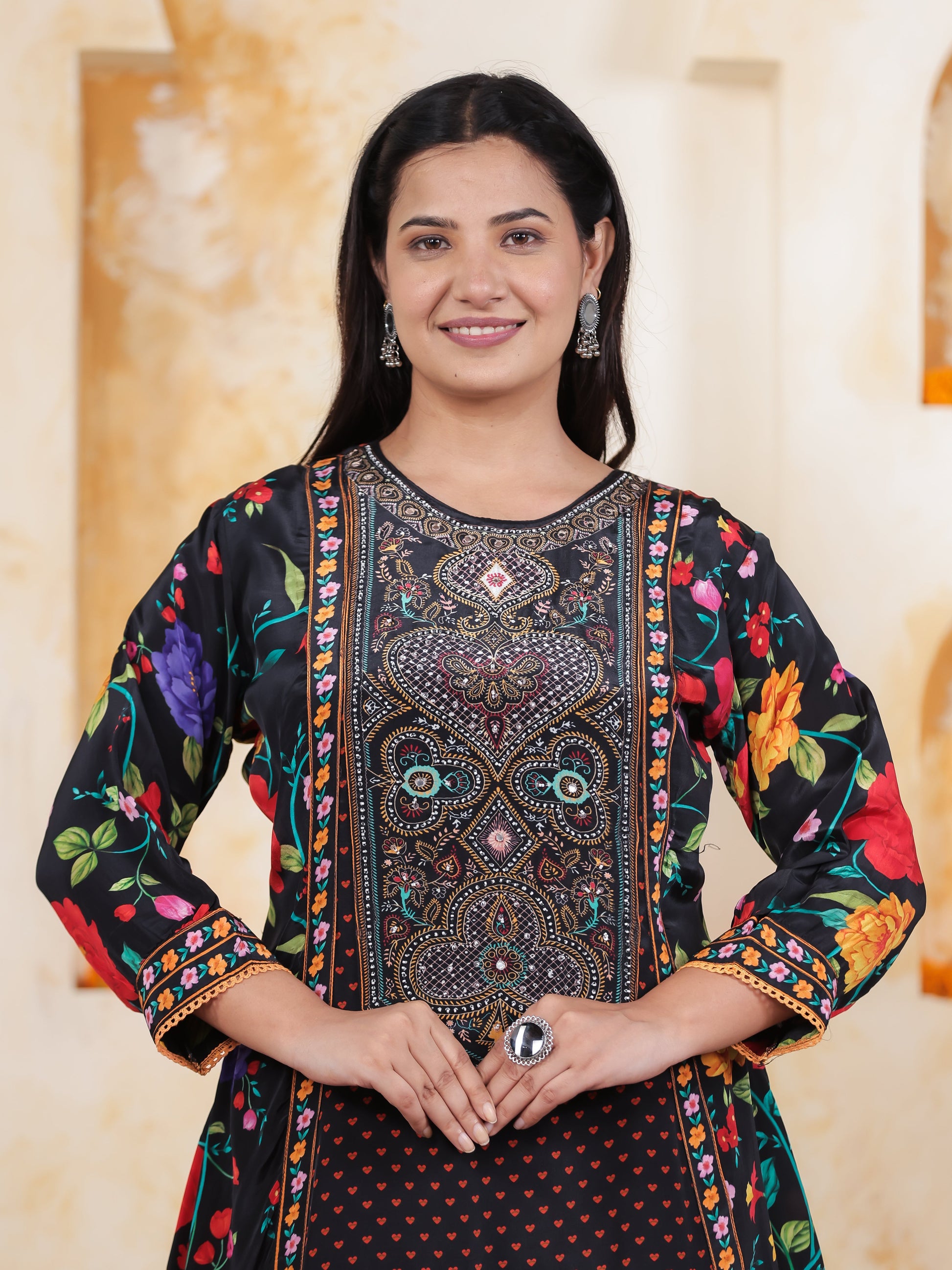 Mirror Embroidery Black AOP Satin Straight Kurta