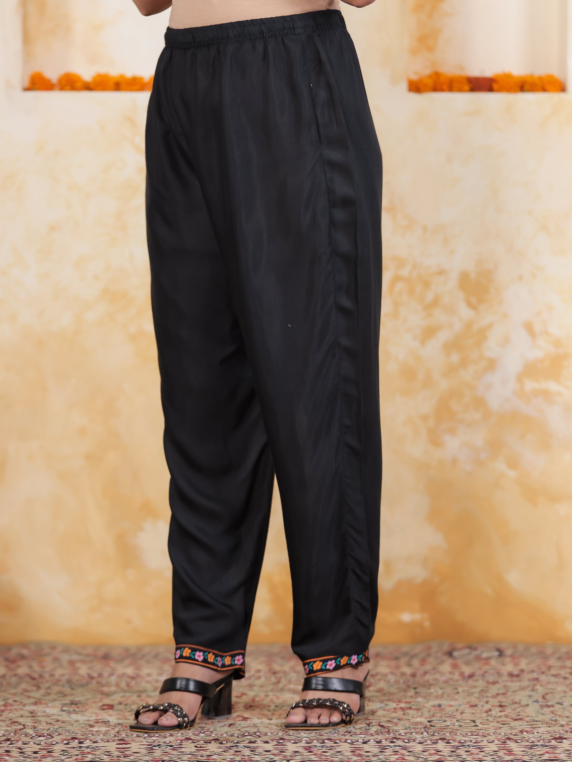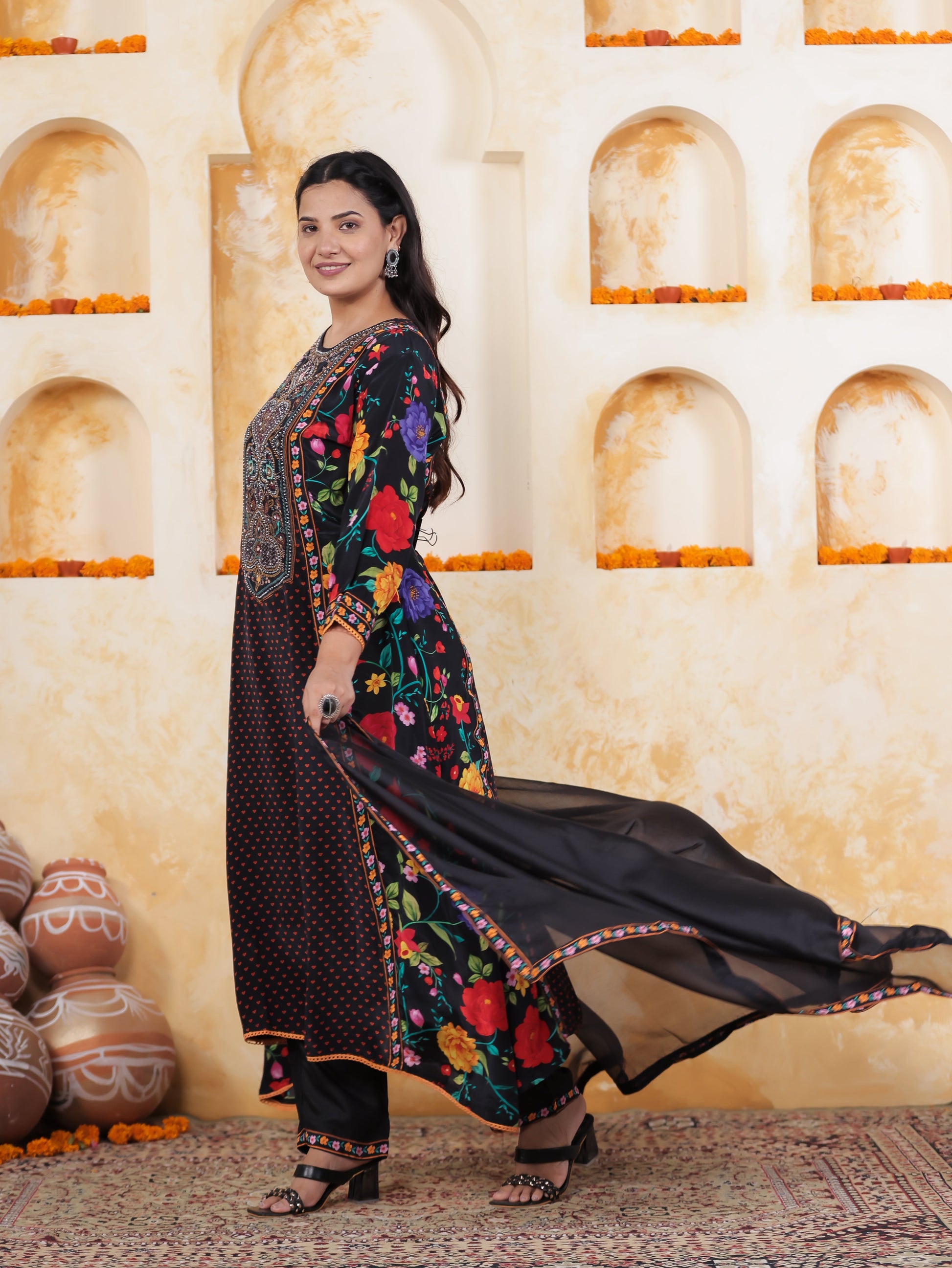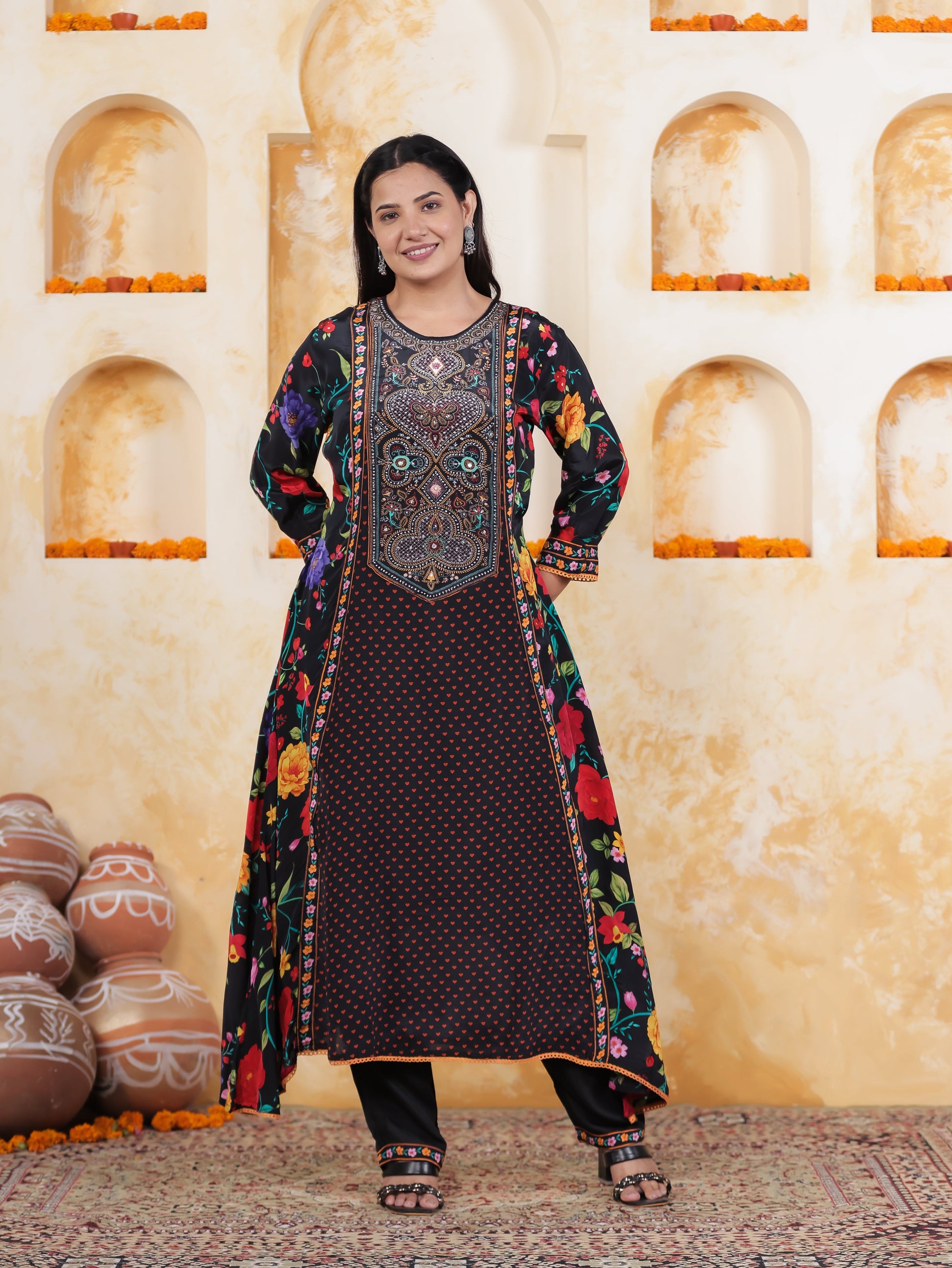 Mirror Embroidery Black AOP Satin Straight Kurta